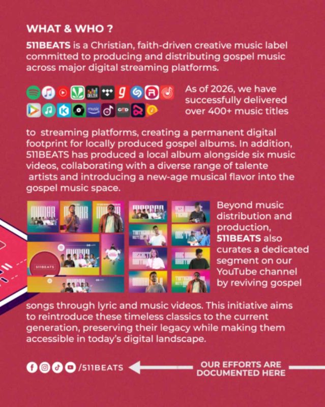 Today, in a time when almost every song seems to be instantly available online, there was once a troubling gap. Malaysian-produced gospel songs, especially the older ones, were often nowhere to be found on digital platforms. There were no proper credits, no metadata, and no accessibility. It was that gap that led to the birth of 511 Beats.